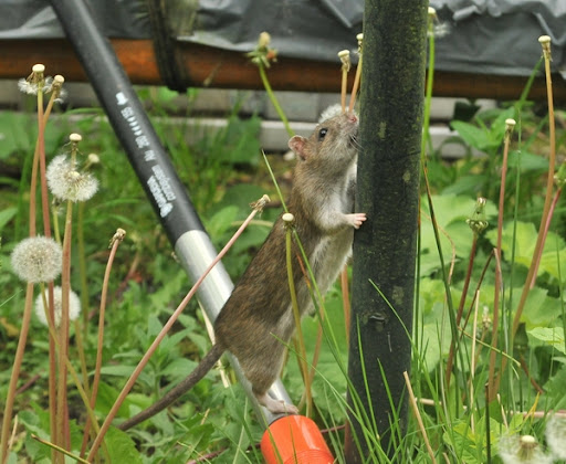 Here he found the rats dining table (collection of green nets which used to contain birdfeed) and his toilet... (the SMELL, but not as bad as that year when he discovered that the drain pipe of our toilet got loose...) I guess the jackdaws aren't as guilty of stealing the birdfood in my garden as I thought they are.
